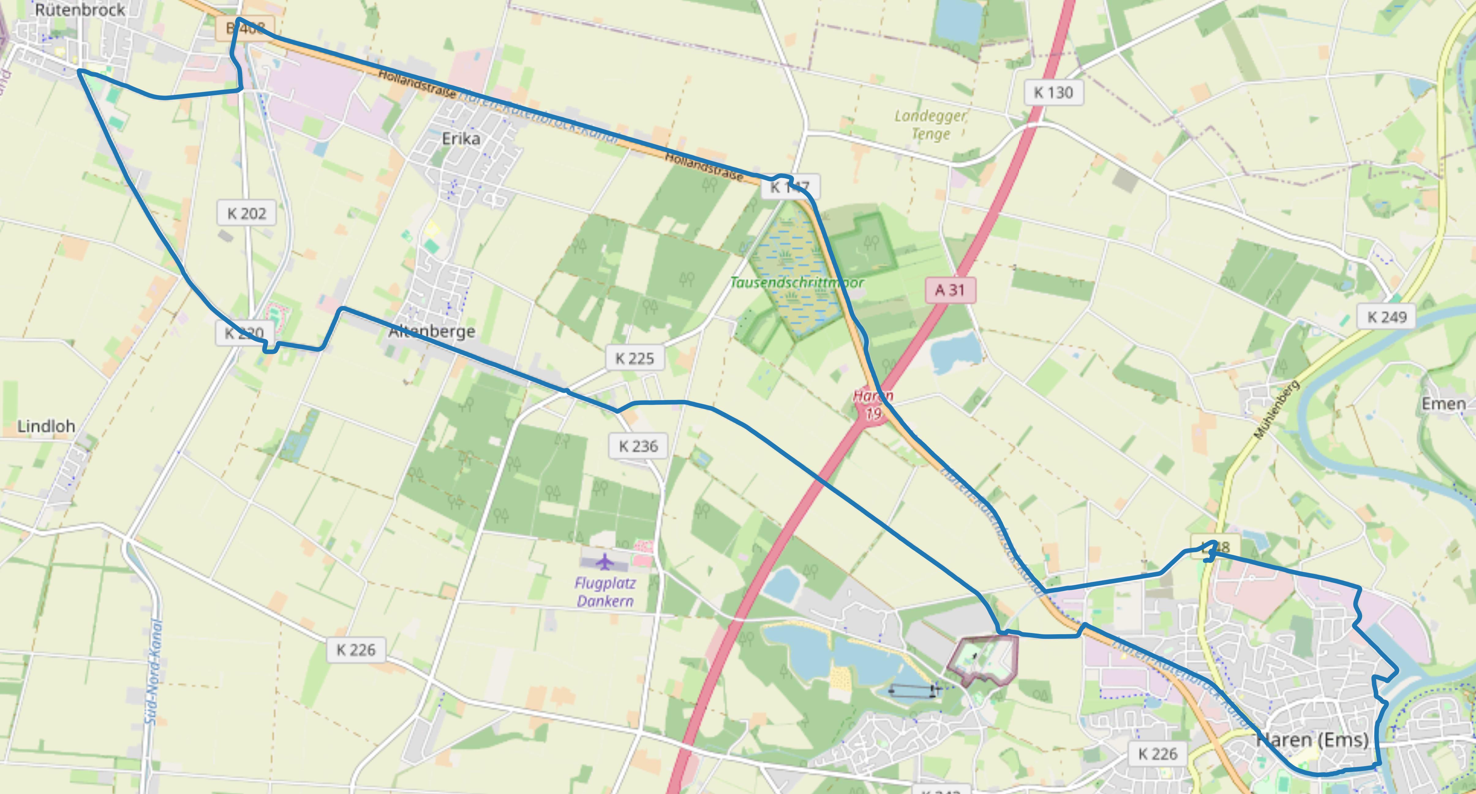 Der Weg führt uns nun durch das Dorf Altenberge und dem Tausenschrittmoor nach Haren (Ems). In Haren geht es entlang des Haren Rütenbrock Kanals und der Ems zu Inselmühle. Dort befindet sich das Dokumentations- & Begegnungszentrum Haren/Maczków.