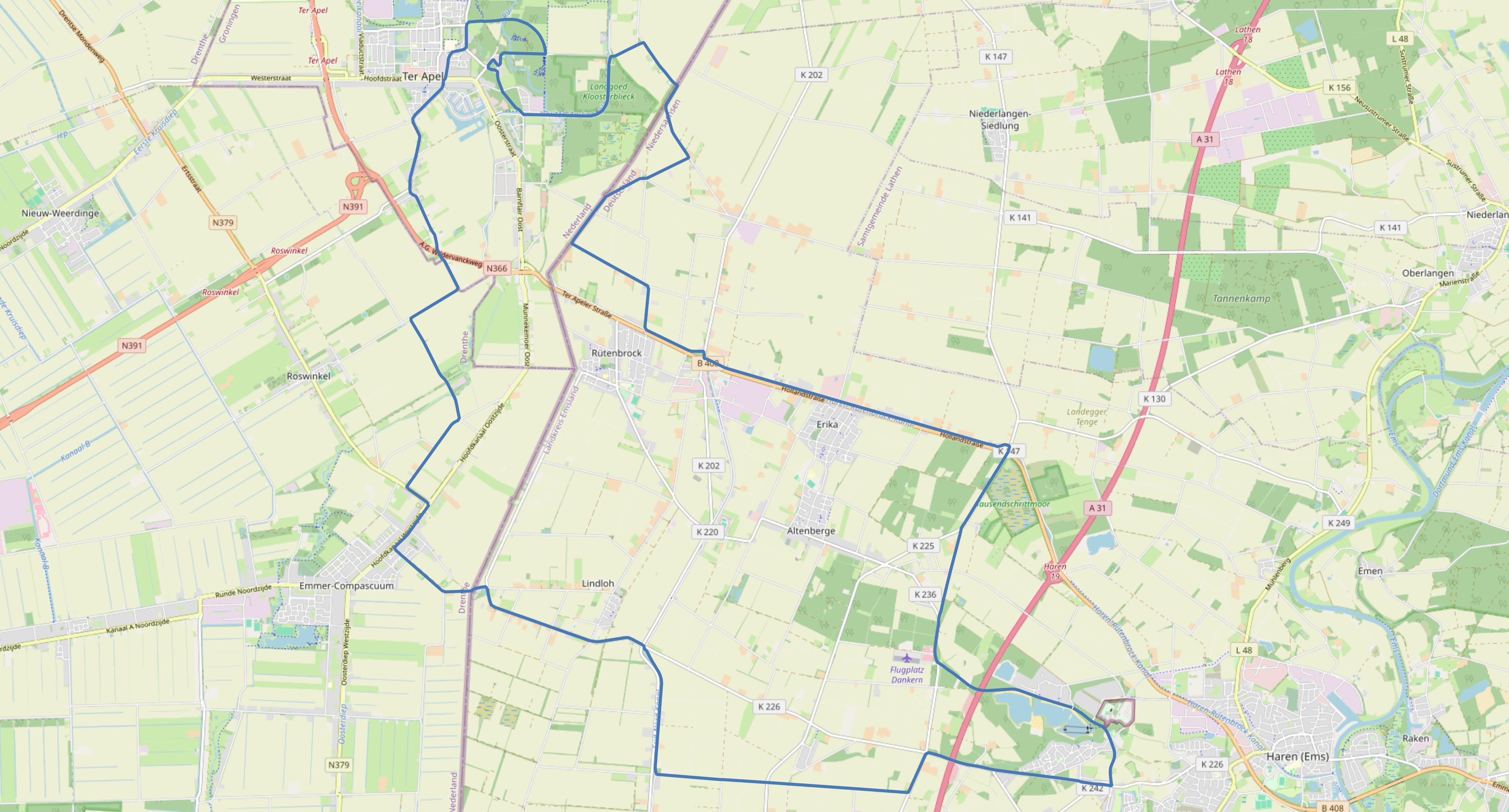 Der weitere Verlauf führt über einen alten Bahndamm. Nach der Durchquerung von Ter Apel gelangt man in das Fleckchen De Maten. Am Kreisverkehr links abgebogen erreicht man nach einem Kilometer die Unterführung an der N 366. Hinter der Unterführung geht es durch die Felder nach Roswinkel.